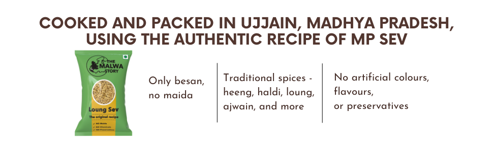 The Malwa Story sev is made in small batches in a kitchen based out of Ujjain, Madhya Pradesh. It follows the authentic MP sev recipe using only besan and traditional spices to ensure you get the original MP sev wherever you are in India.